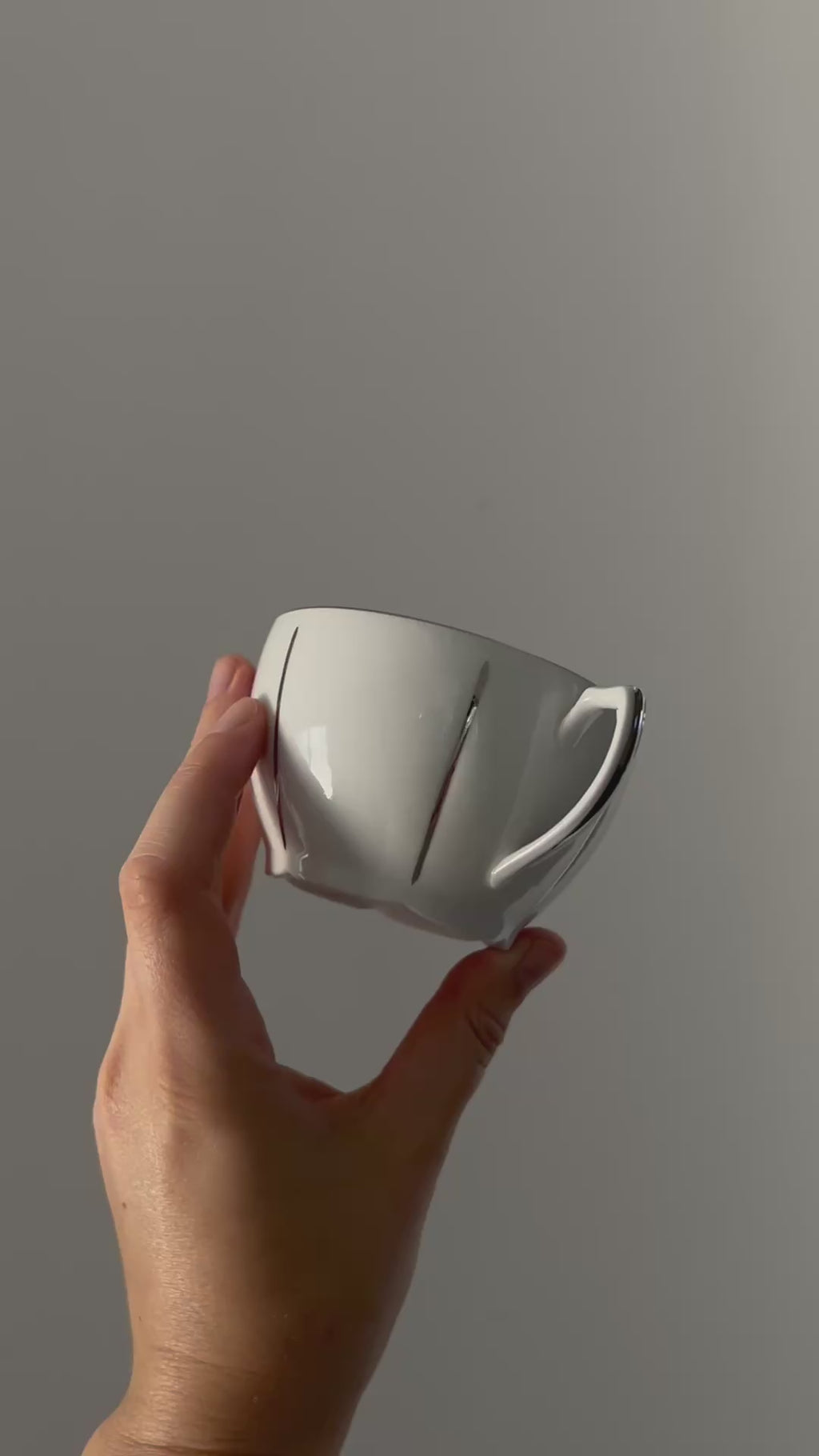 פורצלן לבן איכותי עם קווים גאומטריים עדינים וציפוי כסף דק בשוליים