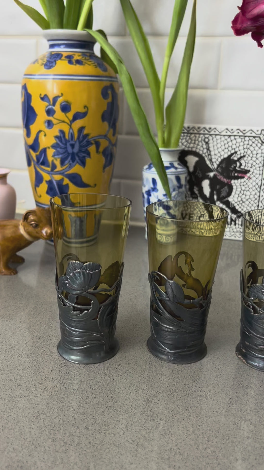Rare Art Nouveau Glass Tumbler Set with Silver Plated Holders