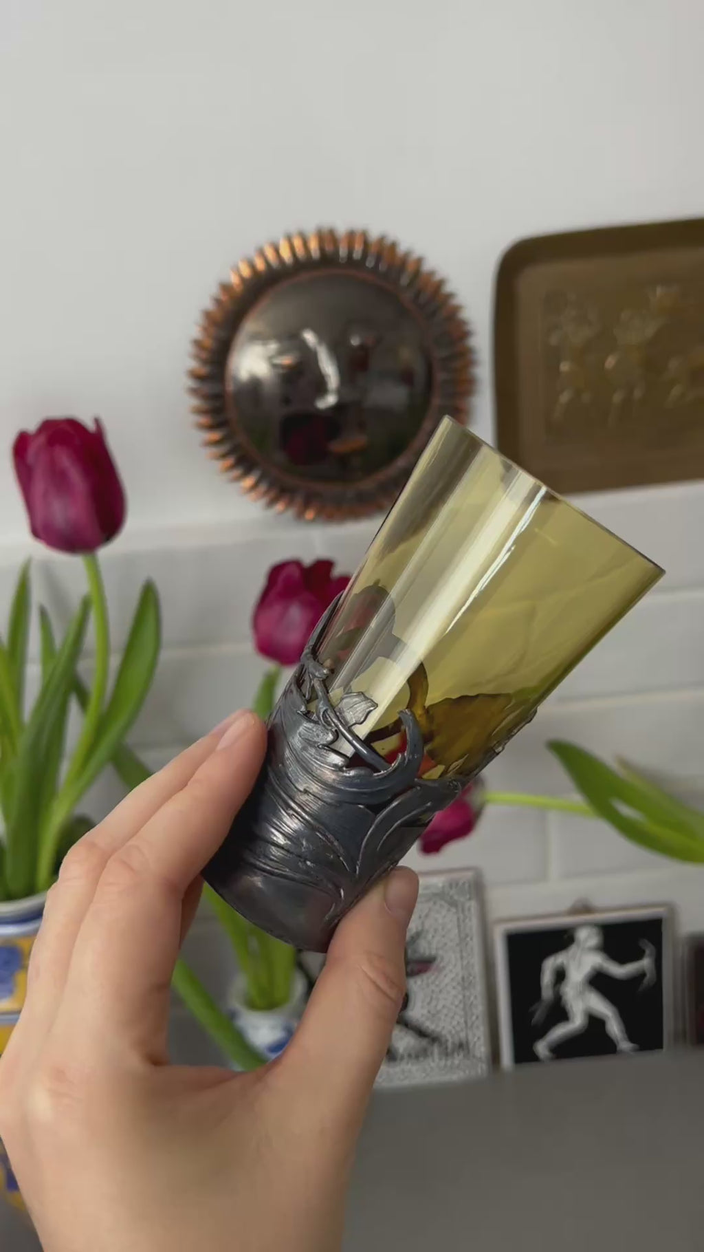 הכוסות עשויות זכוכית בגוון ענבר חמים עם מחזיקים מצופים בכסף עם פטינה עמוקה שמוסיפה לערך