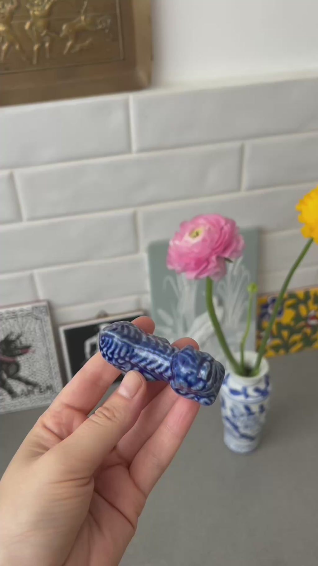 פריט קטן ומיוחד בדמות Foo Dog סיני מסורתי עשוי פורצלן עם גלזורה בגוון כחול קובלט עמוק משמש כמשענת לצ׳ופסטיקס או לסכין על שולחן האוכל