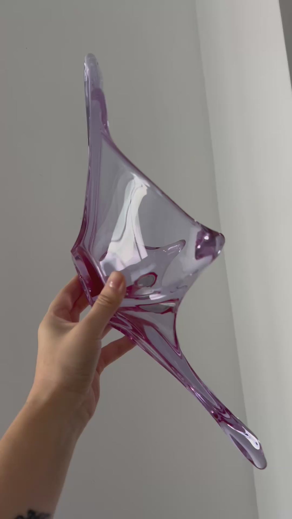 הפריט עשוי זכוכית שקופה עם הדגשות סגולות, בעיצוב פיסולי עם קווים זורמים ושוליים מעוצבים, אופייניים לעבודות הזכוכית האמנותית של אמצע המאה ה-20